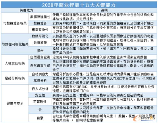 国际知名研究机构Gartner认为,现代分析与BI平台应具备15项关键功能,具体包括与数据准备相关的数据源连接性、数据准备、数据复杂性;与数据可视化相关的数据可视化、数据叙事、报告;与人机交互相关的自然语言查询、自然语言生成;与增强分析相关的自动洞察力、高级分析;与部署与安全相关的嵌入式分析、安全性、可管理性、云和目录。这15种关键功能实际上也都是智能BI所必须具备。