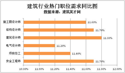 从招聘的具体职位来看,建筑英才网首页的招聘信息显示,截至10月中旬,安全工程师、项目总工、电气设计师的人才招聘需求同比增长11.7%、11.4%、11.2%。建筑设计类人才招聘中,建筑设计师、结构设计师、施工图设计师的需求与去年同期相比增长较快,同比涨幅分别为11.8%、11.7%、11.6%。